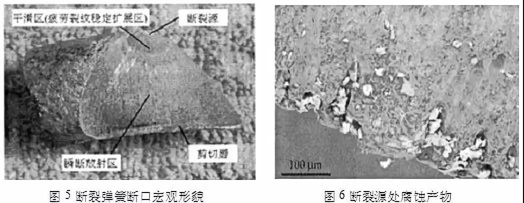 實例:對某電廠汽輪機主汽門操縱座彈簧的斷裂失效進行了分析。結(jié)果表明:彈簧材料化學(xué)成分及組織都符合國家標(biāo)準(zhǔn),導(dǎo)致其早期疲勞斷裂的主要原因是彈簧表面的腐蝕坑(如圖5,圖6);腐蝕坑是在彈簧使用前的放置過程中形成的,改善彈簧放置環(huán)境和縮短放置時間可以避免腐蝕坑的產(chǎn)生。